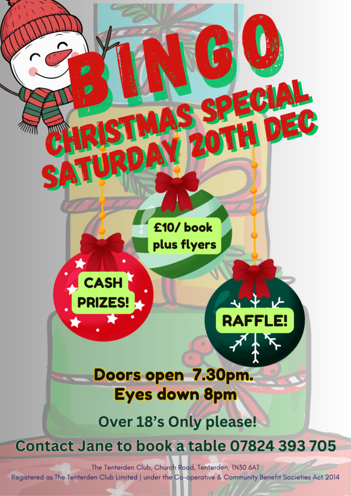 Join us for our Bingo evenings at The Tenterden Club, watch the calendar for new dates. Dabbers at the ready…. Our special Christmas edition 20th December 2025 […]